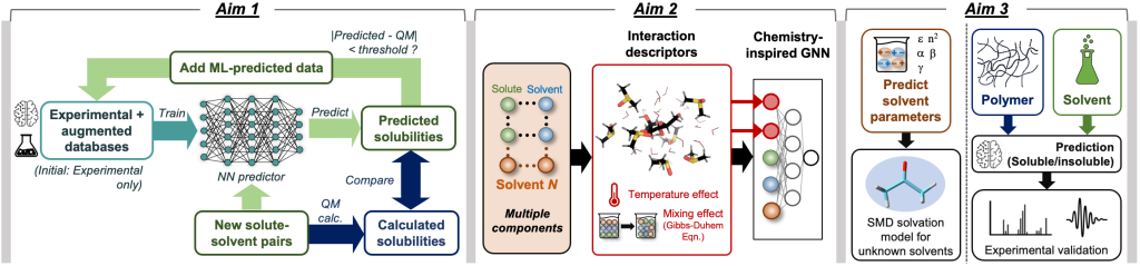 Associate Professor Seonah Kim in the department of chemistry, has received a National Science Foundation (NSF) award to develop solubility databases and neural network models from the Chemical Theory, Models, and Computational Methods (CTMC) program in the NSF Division of Chemistry. The three-year, approximately $449,440 grant will allow Kim’s group to design chemical processes with multicomponent solvents through self-evolving solubility databases and neural networks. By using novel data augmentation techniques, the Kim group will develop self-evolving databases which can reconcile differences between experimental and computational data. The graph neural networks (GNNs) from this work will be applied to unknown solvents as well as unknown polymers, yielding robust and experimentally verified ML models to predict solubility over a broad swath of chemical space.